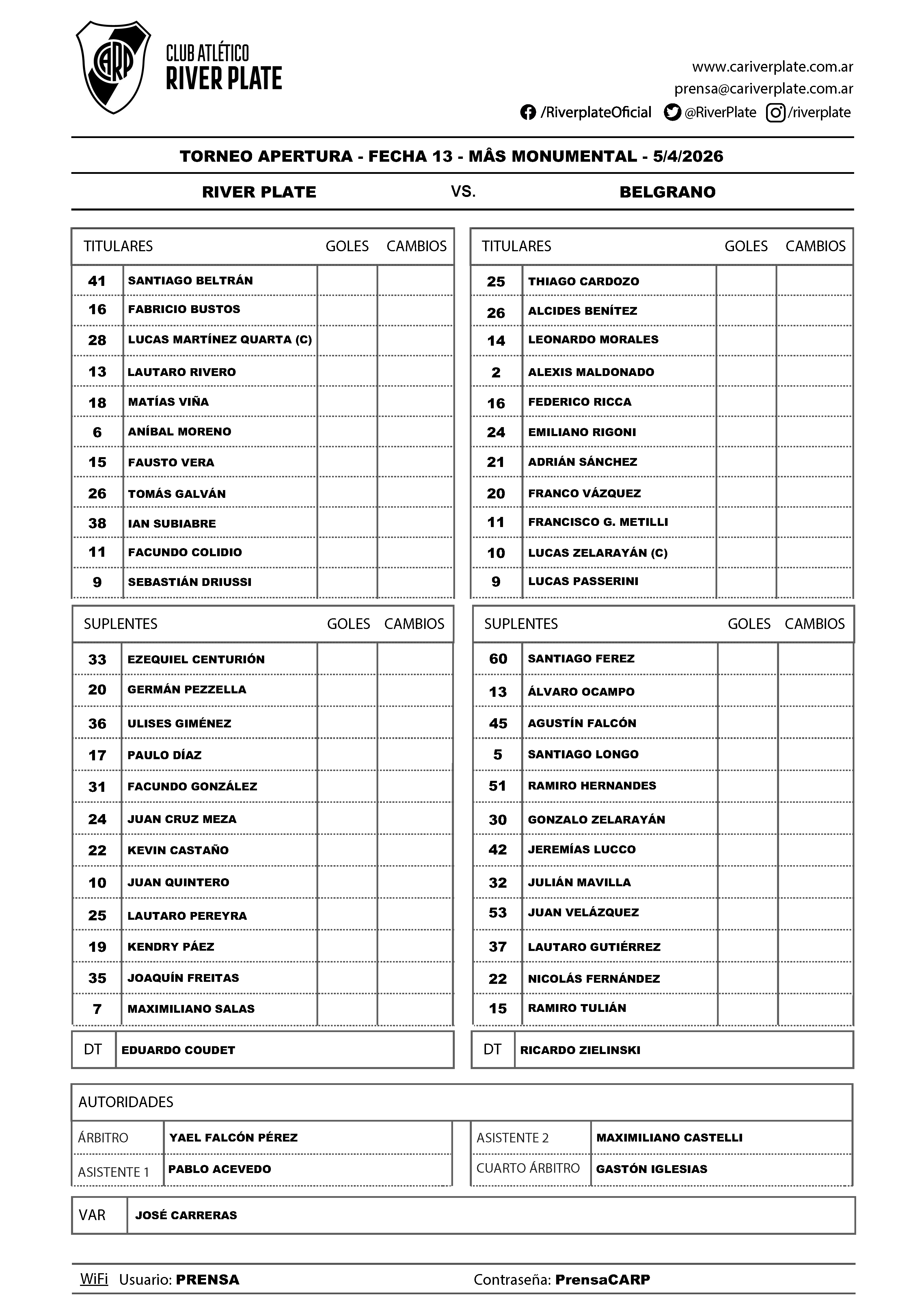 Formaciones - River vs. Belgrano