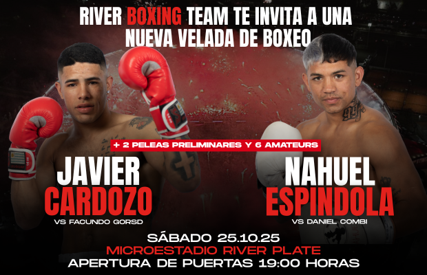 Sábado 25 de octubre - Nueva velada de boxeo en River River Boxing Team volverá a ser protagonista con una nueva velada de boxeo profesional en el Microestadio del Club; la jornada comenzará a las 19, con una cartelera que promete acción de alto nivel, tanto en el plano profesional como amateur.